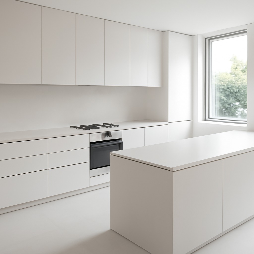 • Design Minimalist și Linii Curate: Mobilierul are fronturi netede, fără mânere vizibile (sisteme push-to-open sau mânere integrate), creând un aspect unitar și ordonat. Se evită detaliile ornamentale excesive.