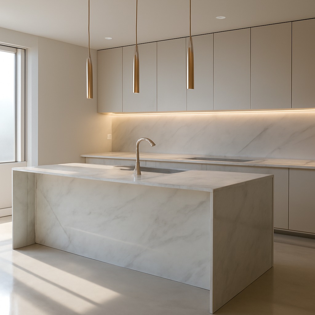 - Aspectul masiv: Deși elegante, insulele Waterfall pot părea voluminoase, mai ales în bucătăriile de dimensiuni medii sau mici, aglomerând vizual spațiul.