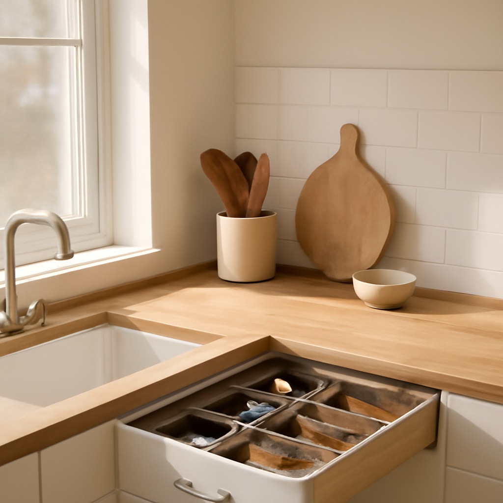 Această metodă nu doar că rezolvă problema lipsei de sertare, dar adaugă și un element estetic unic, aducând o notă de originalitate și prospețime în designul interior al bucătăriei.