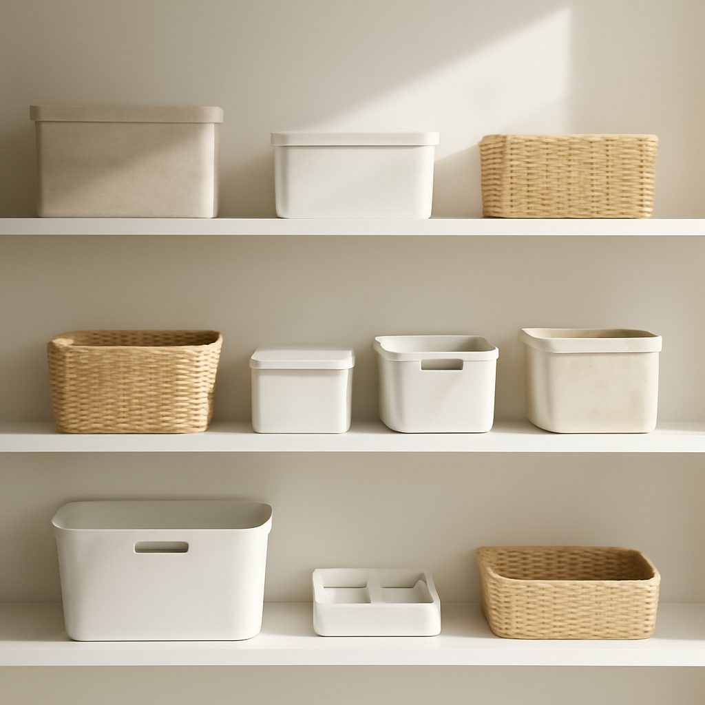 - Ascunderea dezordinii: Cutii decorative, coșuri elegante sau unități de depozitare cu uși.